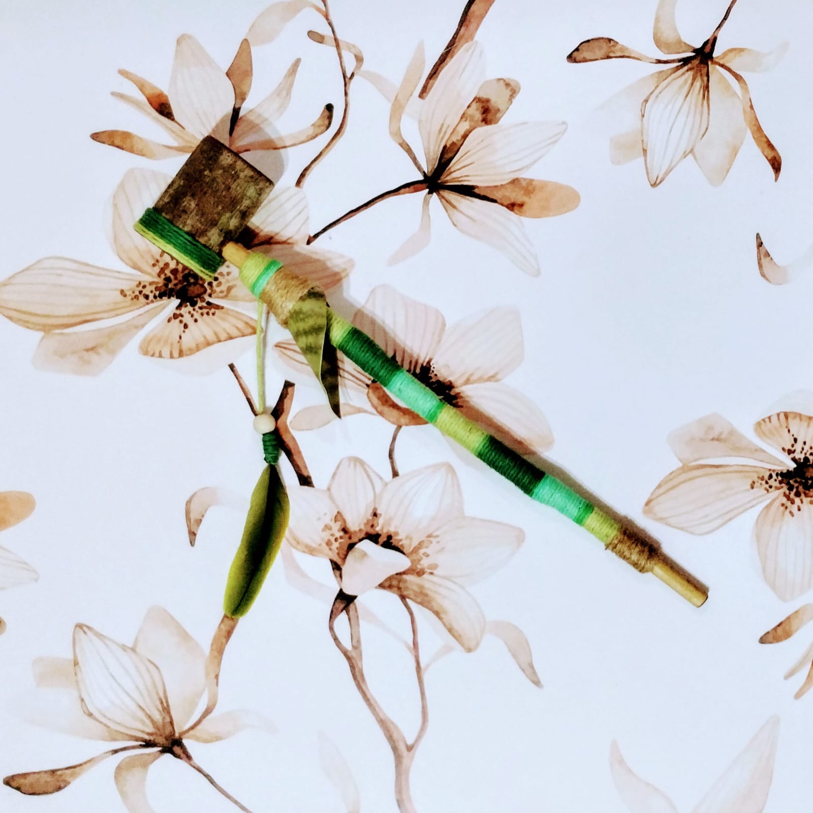 Material: madeira, bambu, fio barbante de algodão, fio de juta, folhagem sintética, conta de madeira e penas.